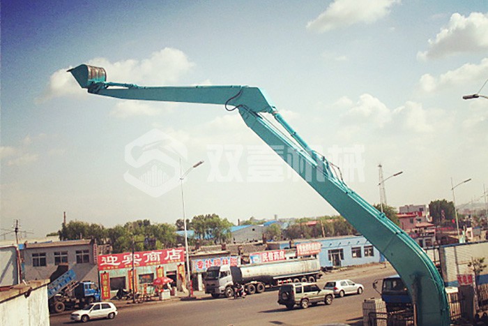 加長臂:加長臂是我們最常見,使用時間更早的大小臂加長臂,不需要伸縮缸控制。它通過大臂、小臂同時加長,配帶小挖斗,擴大機械的工作范圍。